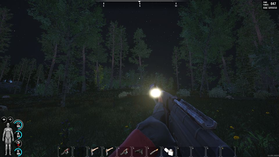 せっかくなので安全を確保した建物の中で引きこもってようかとも思ったんですが、どうも近くにイノシシがいるらしくブヒブヒと鳴き声が聞こえるので、肉の確保も兼ねて狩りに行くことにします。ミッドナイト・ハンティングです。