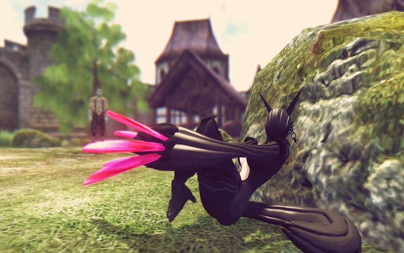 下調べ中になんとなく適当なポーズ取らせたら意外と絵になっていたので思わず写真撮影してしまった、そんなシェイディンハルの街中。おそらく本編では出番がないであろうMecha Foxさんとともに、後ろで見守っているのは改変形SSであるにも関わらず本編同様あえなく死を遂げたオルドス・オスランさん。
