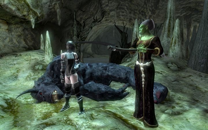 勇敢にもナイトメア・トロールの背後から飛びかかり、柄の両端に刃がついた槍で斬りかかったのは、高級なローブを身に纏ったオークの女性だった。