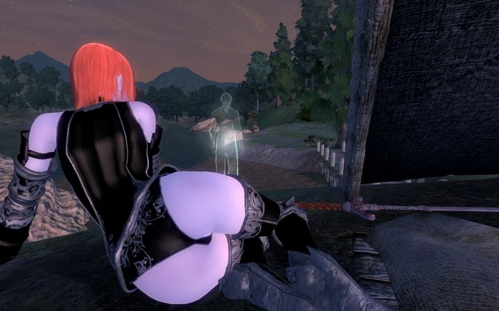しばらく呆然としていたちびのノルドだったが、すぐにマスクを装着し、ラグダンフ卿の剣を背負って幽霊の後についていく。