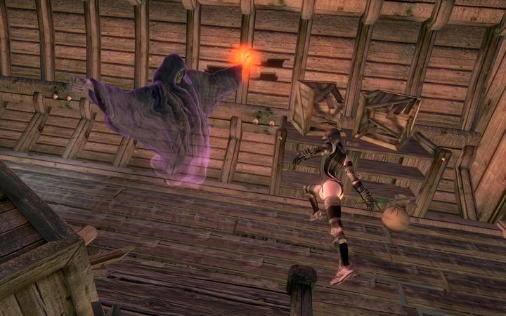 肉体を瞬時に凍結させる冷撃魔法がちびのノルドの頭上をかすめ、古ぼけた木箱に命中してそれを破砕する。どうやら、自らの攻撃行動で船が大破しかねない点については考慮していないようだ。
