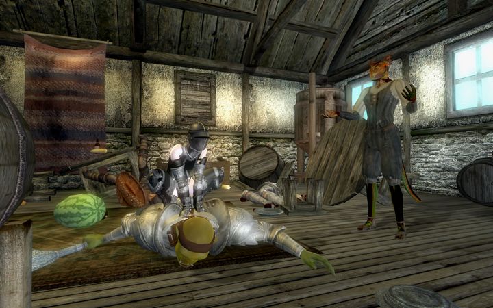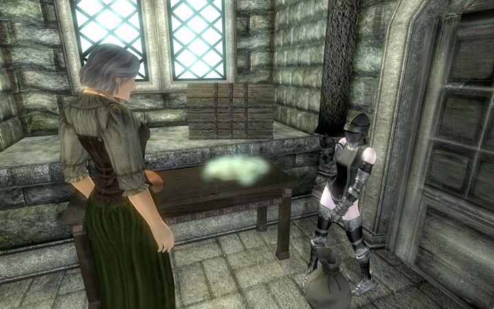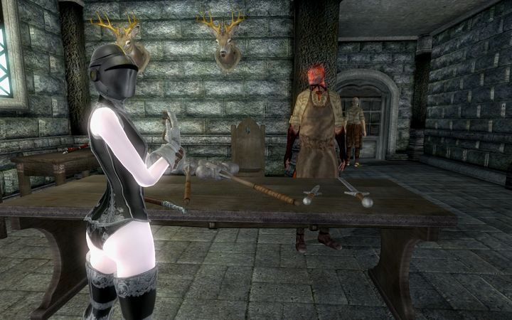 ゴーストを相手にするため銀製、またはエンチャントが付与されたガントレットを探しに来たちびのノルドは、店主のトゥン=ジィーウスが用意したものを一通り試着したあと、不満げにため息をついた。