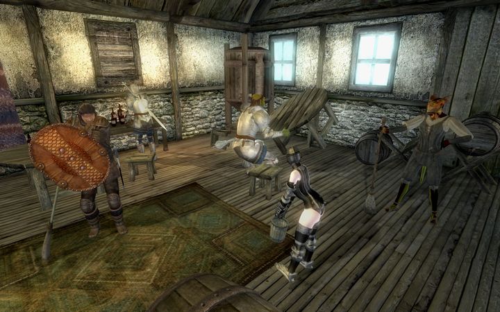 もちろん原因は自分たちにあるのだが、なんとなく釈然としない様子で掃除をする三人の戦士とちびのノルドに、ウィッセイドゥトセイが激を飛ばした。