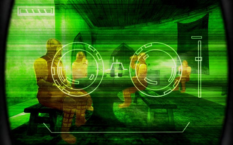 それとなく会話に耳を傾けながら、ミレニアは暗視装置のスイッチを入れ、アクティヴ・ヒートシーカーをオンにした。緑一色になった世界の中で、酒の影響かやや体温が高くなった衛兵たちの姿がくっきりと赤く浮かび上がる。