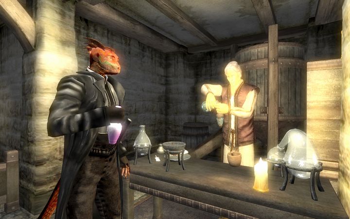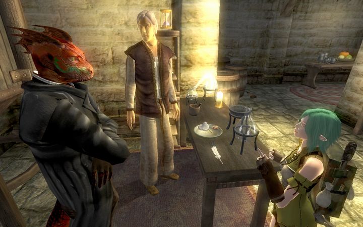 俺のせいじゃないのに…とひとりごちながら、ドレイクはさっさと扉を閉めて階段を下りていった。若干手狭な室内には魔術師が使うような実験器具が所狭しと並んでおり、あちこちに錬金術用の調合素材が積まれているなか、1人のアルトマー(ハイエルフ)がドレイクに笑顔を向けてきた。