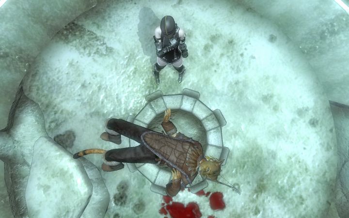 古代アイレイドの遺跡の一つヴィルバーリンの奥地へと足を踏み入れたちびのノルド。彼女が目にしたのは、祭壇の上で命を絶たれた野盗構成員の姿だった。