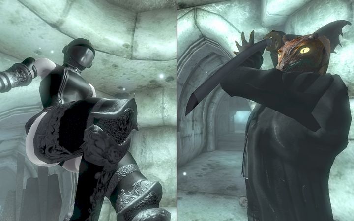 いままで一体どこにいたのか、欠片も相手の気配が読めなかったことにちびのノルドは焦りを感じる。爬虫類の冷たい瞳が、ちびのノルドを見据えた…アルゴニアン、シロディールの南方ブラックマーシュを故郷とする蜥蜴人間だ。