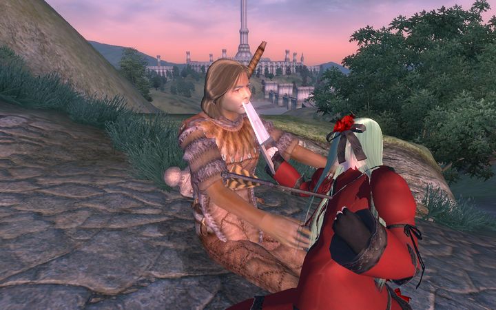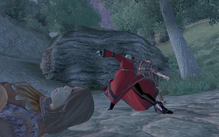 橋の終わりに差しかかったとき、全身をいかつい鎧で覆った戦士が地面にうずくまっている姿が見えた。どうも地下牢で皇帝を襲撃した連中と姿がそっくりだが、なぜこんなところで股間をおさえてぶっ倒れているのかはわからなかった。