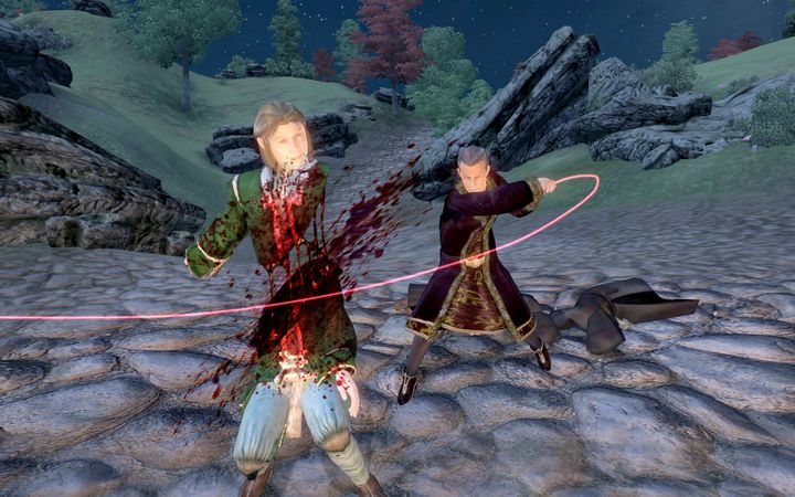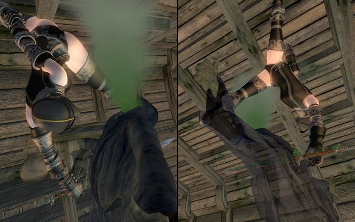 ふっとゲイブルの力が抜けたのを機に、ちびのノルドは全身の体重を乗せてラグダンフの剣を彼の胸に突き立てる。さらに大きなダメージを与えるべく、ちびのノルドは柄を握ったままゲイブルの頭上に躍り出た。
