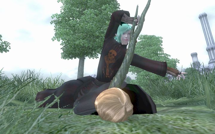 棍棒を片手に一人漫談しているネクロマンサーの背後から、ミレニアは木の枝を手にそーっと近づく。