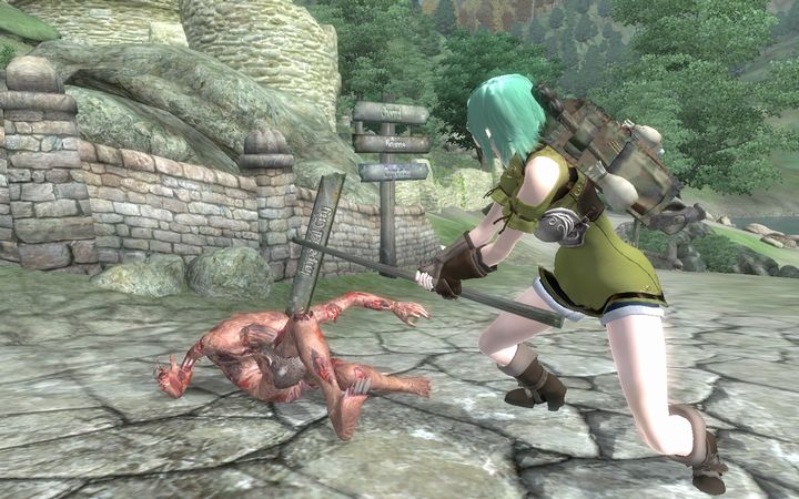 ミレニアは、自分の背後に設置されていた<道路標識>を引っこ抜くと、ゾンビの頭部を両断せんばかりの勢いで殴りつけたのであった。ゾンビの身体が奇妙な角度に曲がっている。
