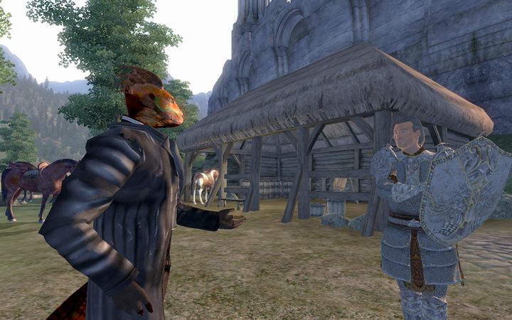 一足先に馬を厩舎に停めに行ったクロードが、何者かと話している姿が見える。セプティム硬貨の詰まった皮袋を先方に渡すと、クロードは対外用の笑顔のままドレイクのもとへ戻ってきた。