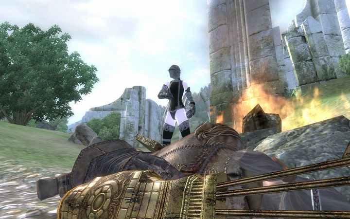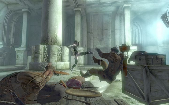 幾人もの殺し屋を叩き伏せた末に、リーダーらしき男の姿が見える。その足元には、斬り捨てられた皇帝ユリエル・セプティムの亡骸が横たわる。