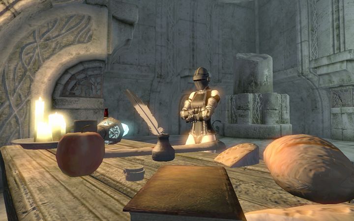 弓兵の担いでいた矢筒から数本の矢を抜き、テーブルについて食事をしている男に近づく。ちびのノルドは男の頭を掴んでテーブルに叩きつけると、手にした矢をまとめて耳に突き立てた。