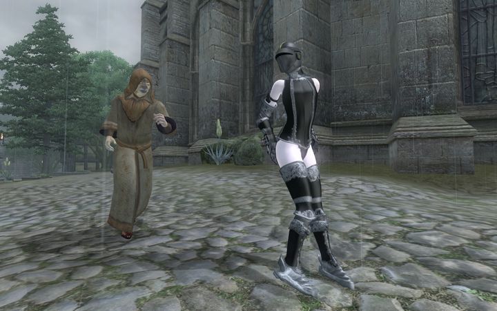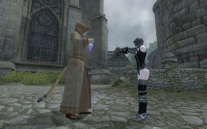 雨の中を猛然と走ってくるローブ姿のカジート、魔術師ギルドの者だろうか?