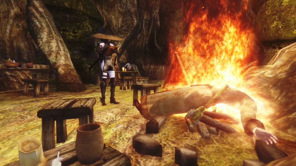 洞窟の最奥には男が一人で暮らしており、話しかけたところ、いきなり襲われたので正当防衛を行使した。死体が燃えているのは斬り捨てた拍子に偶然、焚き火に向かって吹っ飛んでいったからで、他意はない。