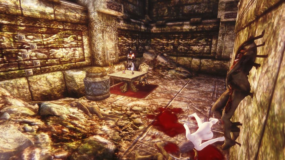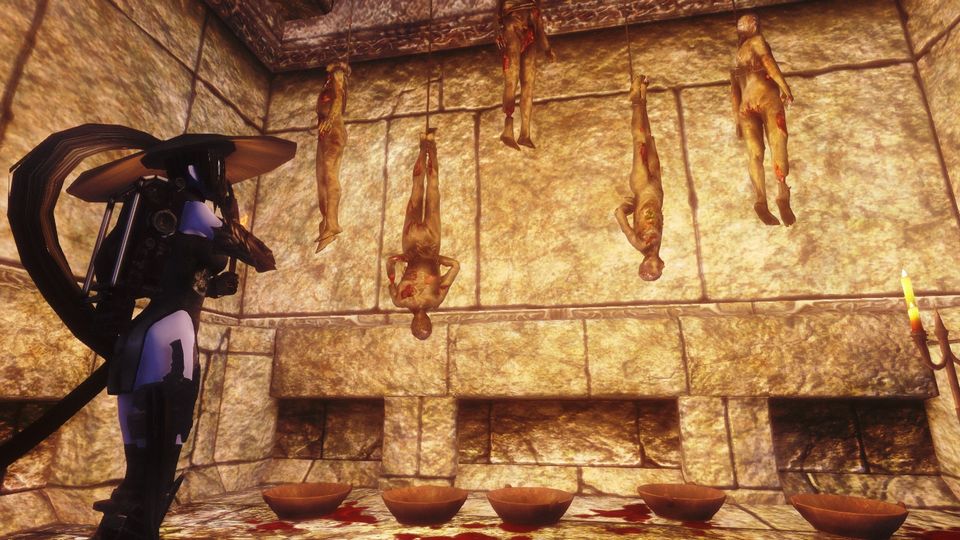 また別の場所では、多数の死体が宙吊りにされている光景を目撃する。床にこぼれた大量の血液、雑に置かれた陶器の皿を一瞥。