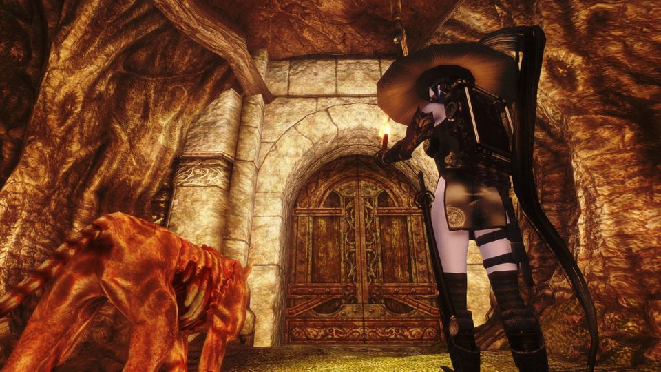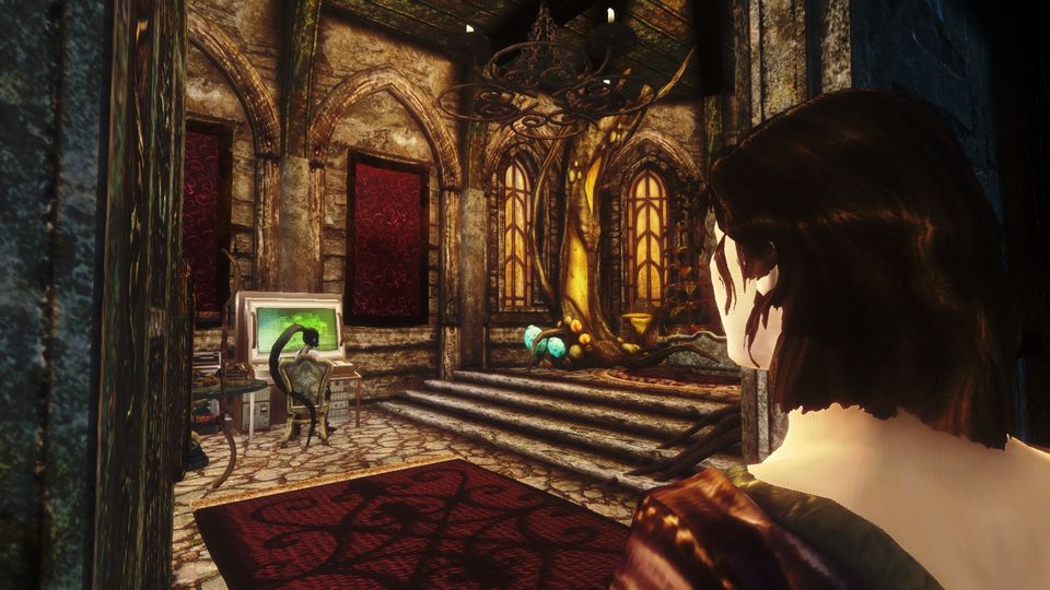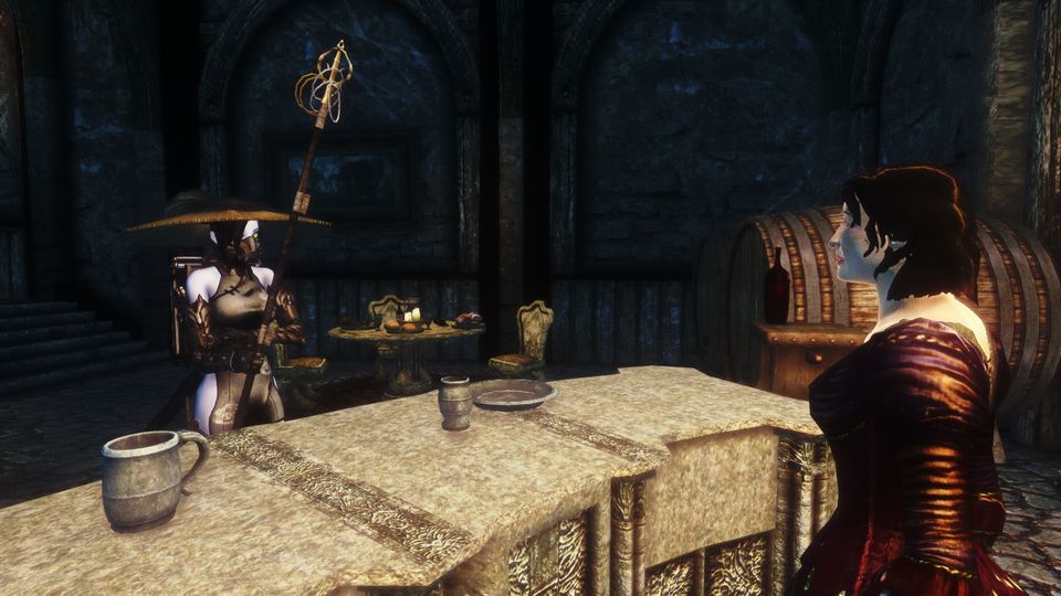 戦闘ののち王宮へ帰還し、セイドン公爵に杯を渡したあとマニア/ディメンシャ両公爵から信頼を得たことをシェオ爺さまに報告する。そのポーズ、DOS時代のTESシリーズっぽくてすごく良いです。