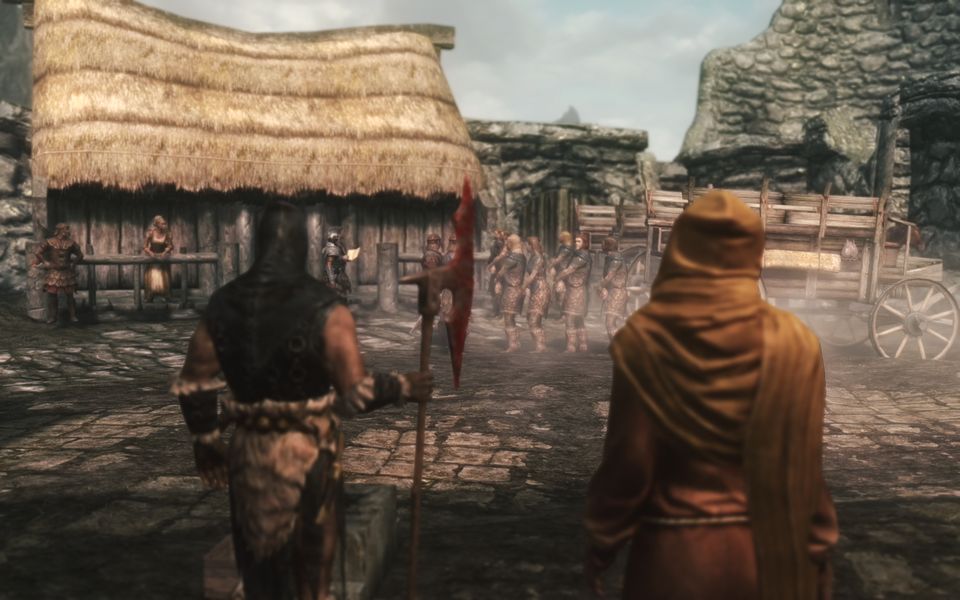 皮鎧に瑠璃色の布を巻いた兵士…スカイリム独立のため集結し、帝国やアルドメリと戦うため組織された反乱軍ストームクローク。その名の由来であるウィンドヘルム首長、決闘によって上級王トリグを殺害した反乱軍の指導者ウルフリック・ストームクロークもまた、厳重な拘束のもと荷台に押し込められていた。