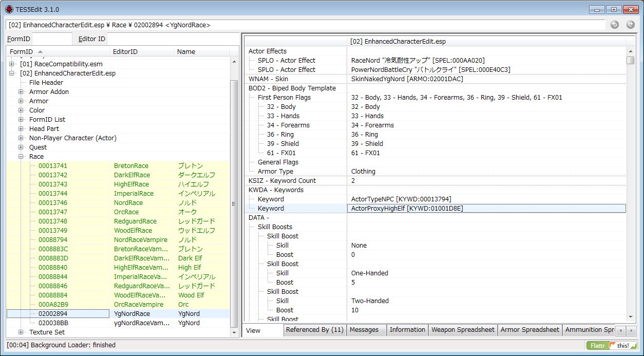 YgNordはこのカテゴリの二行目が「ActorProxyNord」に設定されているため、ここを「ActorProxyHighElf」に変更します。これでNPCとの会話でアルトマー固有の台詞が聞けるようになります。