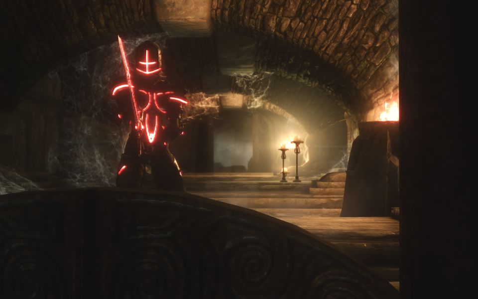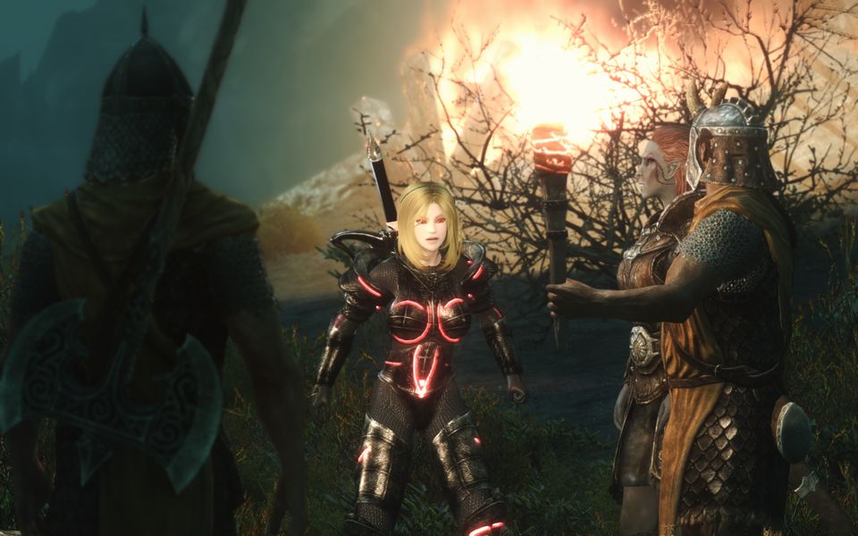 トレーズの使う剣には実際にドーンブレイカーの特殊効果を付与してあります(爆発効果のみ、ベースは炎ダメージではなく体力吸収がエンチャントされています)。まだ画面写真で登場はしていませんが、発動効果を100%に設定してあるので、そのうちドラウグル相手に爆破祭りを敢行できると思います。ちなみにこの能力、内部的には「メリディアの怒り」という名前がついてます。おっかねぇ。いちおうアンデッドにのみ発動するフラグを外せばすべての敵を爆破できるようになるんですが、さすがにビジュアル的にうるさすぎるのと、赤い生命吸収のエフェクトが目立たなくなるので没にしました。