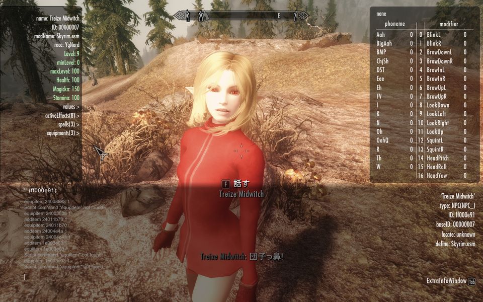 ちなみにロードを挟むと髪が銀色になってしまった。おそらくECEの機能で銀髪をベースに色調整をしていたからだと思うが、どうもPlaceAtMeで作り出したキャラはECEの機能に依存するパラメータ調整を保持できない気がする。仔細に検証したわけではないので、断言はできないが…