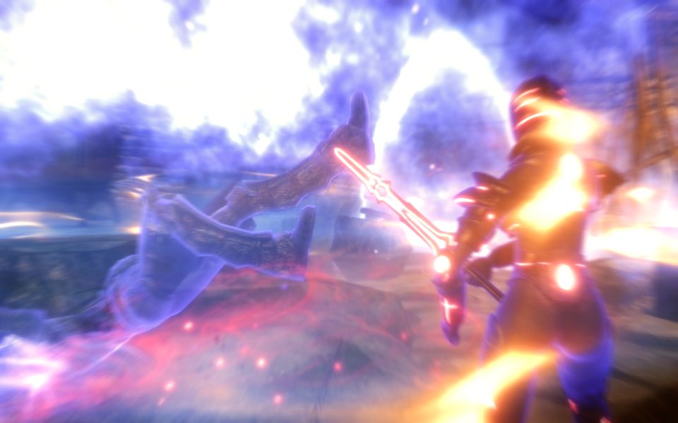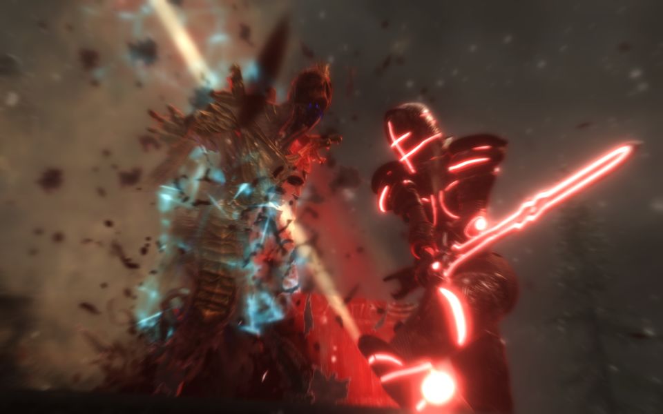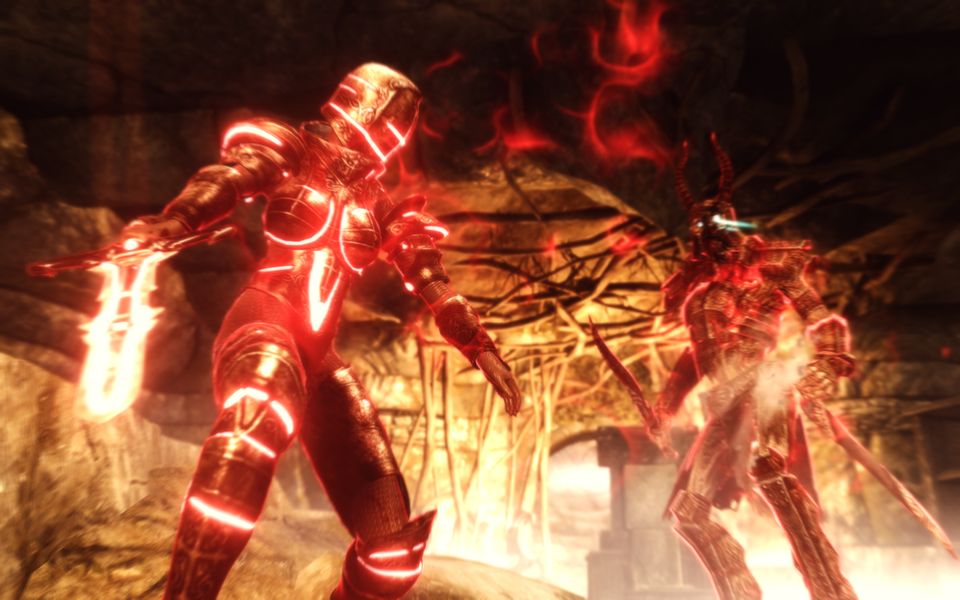 メリディアの加護を受けしナリル・モリの魔剣が死人の気配を感知し、ドラウグル・デス・オーバーロードをアンデッド殺しの炎に包み込んだ。