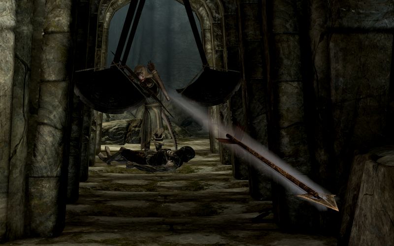 割れた瓶から溢れる油に目をつけた俺は、その真上で揺れる照明目掛けて矢を放つ!床に落ちた照明の火が油に引火し、振り子罠を前に近づけないでいるドラウグルの集団を一瞬で焼き尽くした!