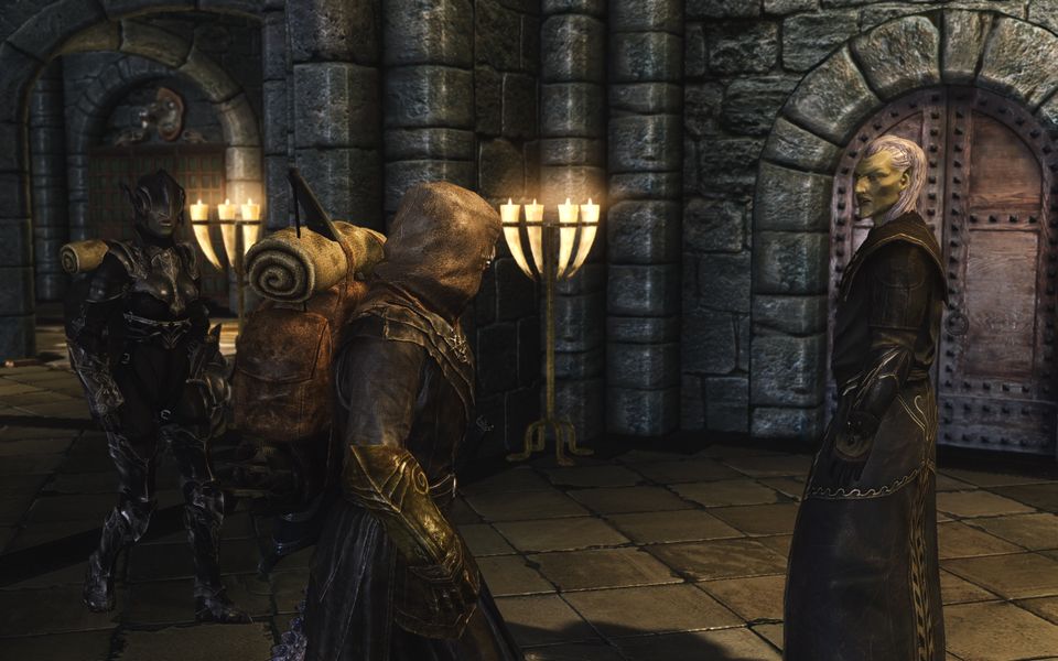 魔術師のローブではなく、サルモールの装束に身を包んだアルトマー。アンカノという、アルドメリから派遣された魔術師だ。たしか、大学の連中が口を揃えて「気に入らん高慢ちきのクソエルフ」と言っていた。いや、そこまで言ってなかったかもしれないが。