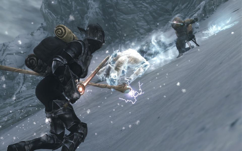 凍りつき、電撃で痺れ硬直したフロスト・トロールの身体が急斜面をゴロゴロと転がって落ちていく。その様子を視界の端に捉えながらも、俺はボルガクが見覚えのない装備を手にしていることに気がついた。