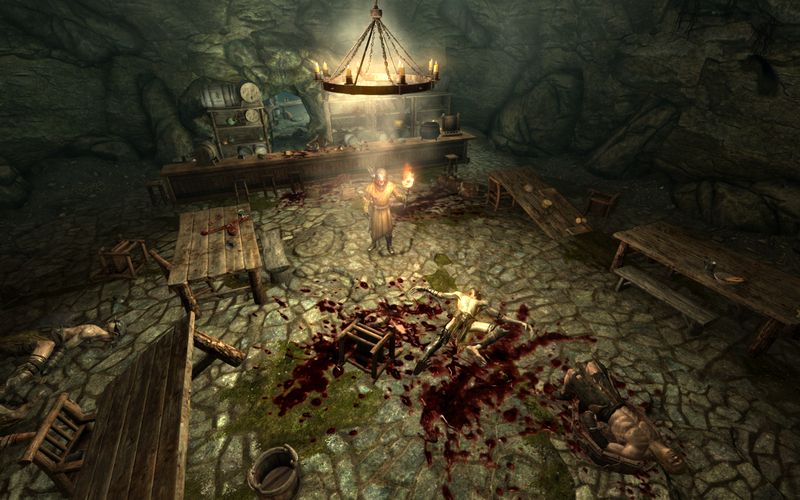 どうやら山賊の住居にファルメルと呼ばれるバケモノ(シロディールでいうゴブリンに近いか?)が大挙して押し寄せてきたらしく、俺はちょうど惨殺パーティの直後に出っくわしたというところらしい。