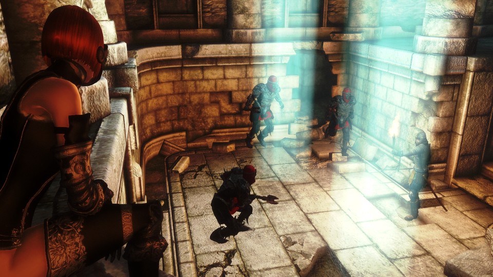 城の地下に存在する遺跡と、そこへ続く地下下水道で逃走中の皇帝一派と暗殺者グループが争う場面に出くわし、助太刀に加わった。奮闘も虚しく皇帝は暗殺者の手にかかり、皇帝からアミュレットを託された自分は、ブレイズの生き残りであるボーラスの助言に従ってこの修道院へ向かった…そのように説明した。